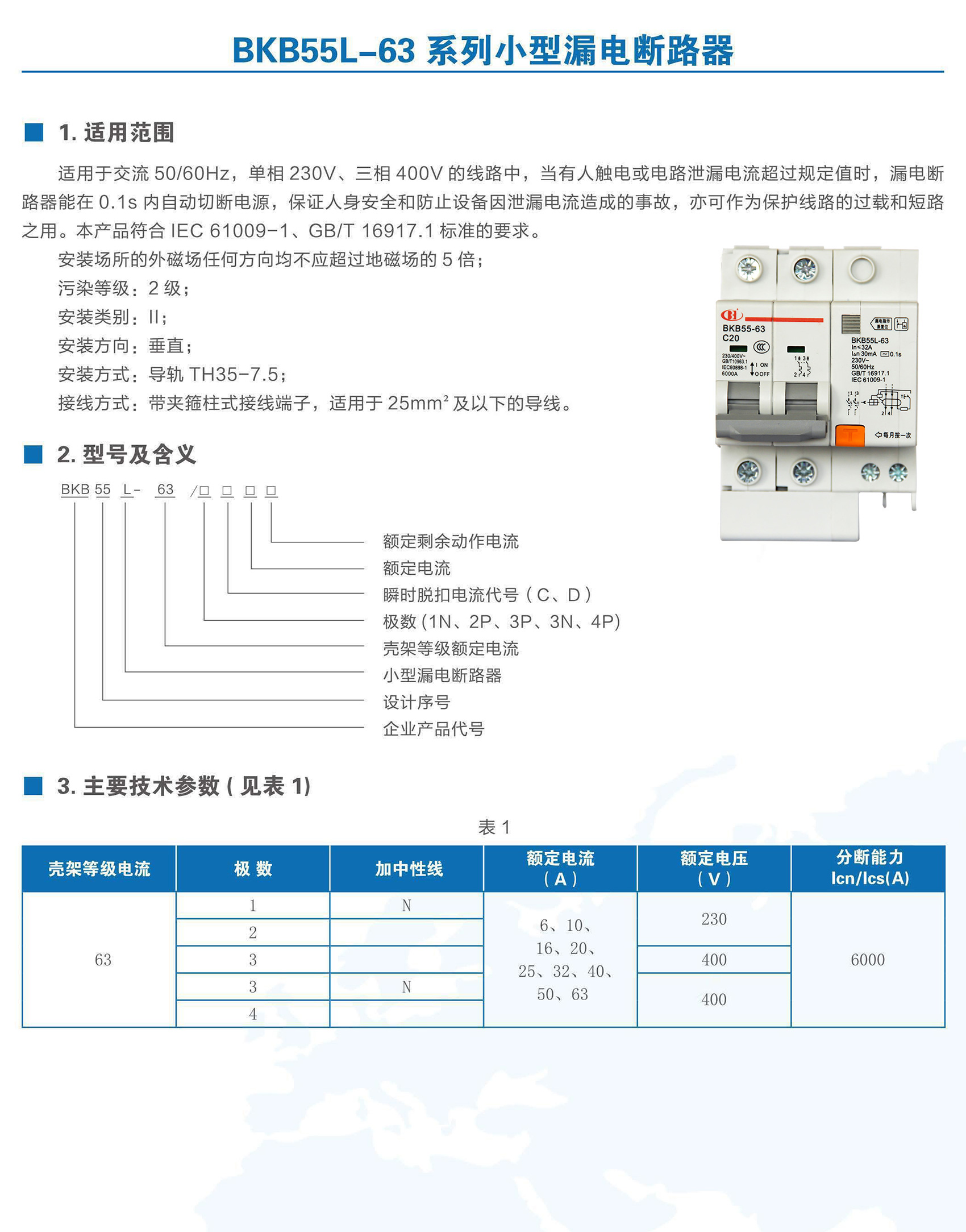 BKB55L-63系列带剩余电流保护小型断路器适用于交流50/60Hz、额定电压至400V,额定电流6~63A 的线路中。作为人身触电和设备漏电保护之用,并可用于线路和电气设备的过载以及短路保护。在正常情况下亦可用于不频繁的通断操作。本产品符合GB/T 16917.1、IEC 61009-1标准。