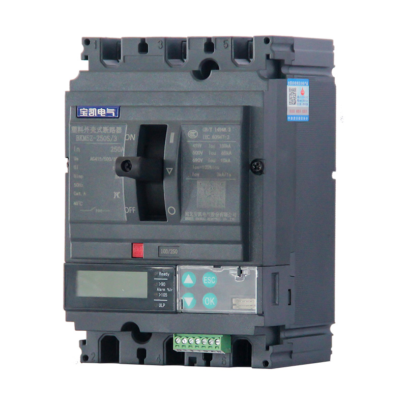 BKM5 系列塑料外壳式断路器适用于交流50Hz,额定绝缘电压1000V,额定工作电压至690V,额定电流12.5A至1600A的配电网络中,用来分配电能和保护线路及电源设备免受过载、短路、欠电压等故障的损坏。亦可作为电动机的不频繁起动及过载、短路、欠电压保护。加装Vigi剩余电流保护模块的断路器,只能上进线。MIC5.0E智能型断路器只能上进线。其他规格的断路器,既可上进线,也可下进线。本系列断路器具有隔离功能。本系列断路器可垂直安装(即竖装),亦可水平安装( 即横装)。本系列断路器执行标准:IEC 60947-1及GB/T 14048.1 《低压开关设备和控制设备 第1部分:总则》IEC 60947-2及GB/T 14048.2 《低压开关设备和控制设备 第2部分:断路器》IEC 60947-4及GB/T 14048.4 《低压开关设备和控制设备 第4-1部分:接触器和电动机起动器 机电式接触器和电动机起动器(含电动机保护器)》GB/T 22710《低压断路器用电子式控制器》